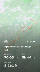 The Appalachian Journey is a favorite event. The scenery, the riding, and the vibe are second to none when it comes to riding in Virginia. We undertook the ride to better our time last year and continue our belief that we are "better together." Mission accomplished on all fronts. The climbing was challenging and very rewarding when sitting at the van after the event. Thanks to Gordon W. Wadsworth and Emily for putting on such a great event. My BaseCamp training has helped me increase my overall fitness every year. The proof of that is that I was 12 minutes faster this year than last year over this very challenging course.